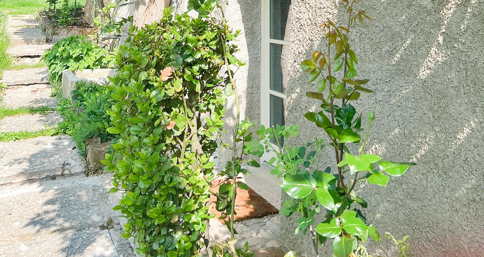 Im süd-östlichen Teil steht eine geräumige Erdgeschosswohnung (piano seminterrato) mit direktem Ausgang zum Garten zur Verfügung. Davor befinden sich ein überdachter Freisitz sowie ein offener Holzofengrill. Der süd-östliche Gartenbereich wird von den hohen Eukalyptussträchern gesäumt. Auch hier gibt es einen überdachten Freistiz mit Holzofengrill. Der Ausgang zum Garten der Erdgeschosswohnung wird im Sommer von einer Glyzinie überwachsen, die farbenprächtig strahlt.