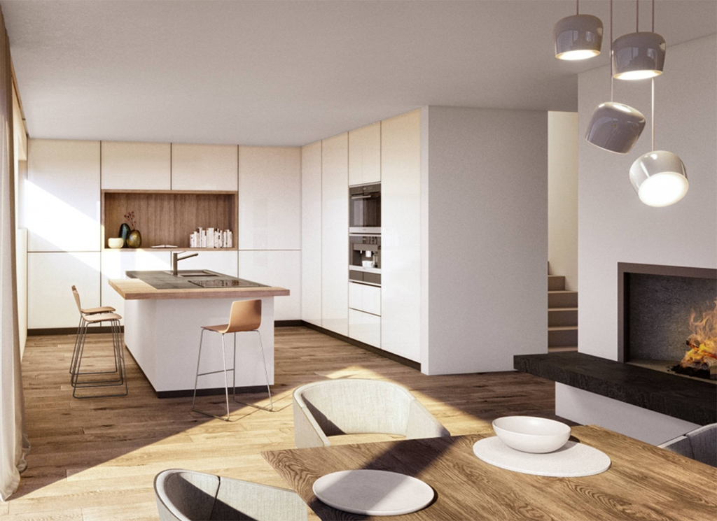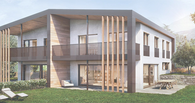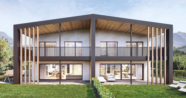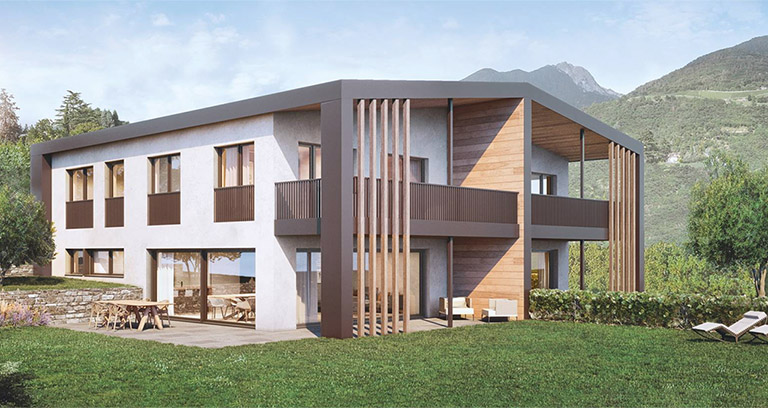 Das Doppelhaus „Weiherhof“ im Finkweg in Meran, Südtirol teilt sich auf in zwei Haushälften, von denen jede mit ca. 155 m² ausreichend Platz zum Leben und Wohlfühlen bietet. Die großzügig geplanten Außenflächen erweitern den Raum in die freie Natur, die dank der bevorzugten, ruhigen Lage direkt vor der Haustür beginnt. Eine Solaranlage sowie die kontrollierte Wohnraumlüftung mit Wärmerückgewinnung tragen zum KlimaHaus-Standard A bei, während die automatisierte Raumentfeuchtung – wie bei allen Wohnungen und Häusern von Bauvision – für ein gleichbleibend angenehmes Raumklima sorgt. Ebenfalls zum Standard von Bauvision zählt die Bodenheizung mit integrierter Bodenkühlung. Die großzügige, unterirdisch angelegte Garage und die großen Kellerräume runden den Wohnkomfort auf allen Ebenen ab.