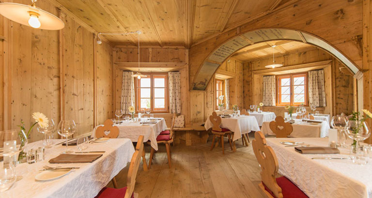 Mittags und Abends bieten die alten Mauern aus dem 14. Jahrhundert das perfekte Ambiente für unvergessliche Stunden. Die romantische Stube mit dem Holzgetäfel aus dem 16. Jahrhundert bietet Platz für 40 Gäste. Weitere Stuben stehen für kleine und große Firmenfeiern, Geburtstagsfeste und Hochzeiten zur Verfügung.
